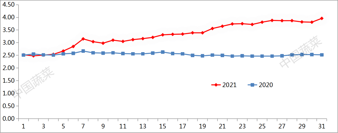 月內(nèi)的最高價(jià)是3.96元/公斤(10月31日),月內(nèi)的最低價(jià)是2.48元/公斤(10月2日),比9月份的2.26元/公斤上漲9.73%。最高價(jià)比最低價(jià)高出59.68%,月內(nèi)的最低價(jià)出現(xiàn)在月初,最高價(jià)出現(xiàn)在月末,說明10月份蔬菜價(jià)格整體呈現(xiàn)連續(xù)上漲的態(tài)勢(shì),漲幅巨大。